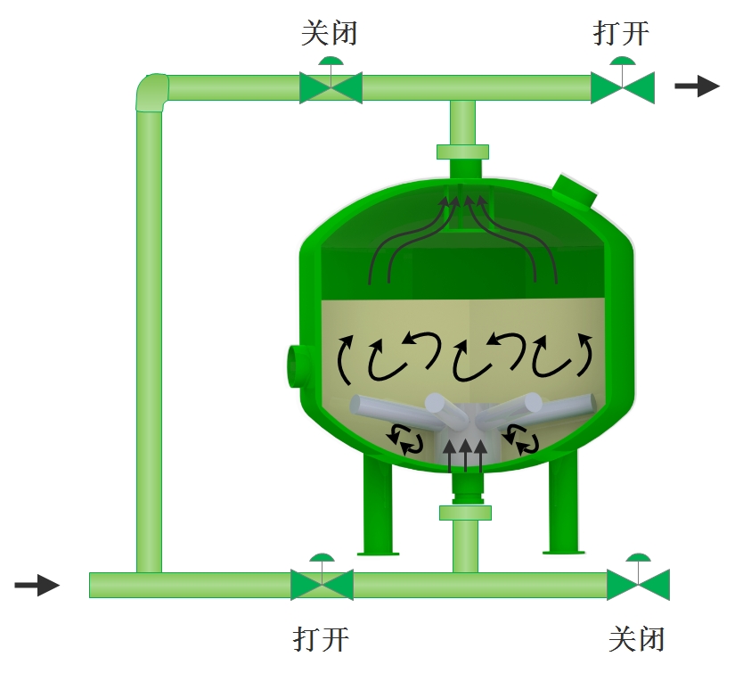 隨時(shí)雜質(zhì)在濾料層中不斷聚積,壓力損失不斷增加,當(dāng)壓差增加到某一設(shè)定值時(shí)或到達(dá)設(shè)定的清洗時(shí),系統(tǒng)將自動(dòng)轉(zhuǎn)換至反洗狀態(tài)。加壓水通過(guò)集水裝置進(jìn)入濾料層,對(duì)其進(jìn)行沖刷,使截留的污染物脫落并排出過(guò)濾系統(tǒng)。反洗持續(xù)至少2分鐘后,閥門自動(dòng)將系統(tǒng)轉(zhuǎn)至過(guò)濾狀態(tài)。