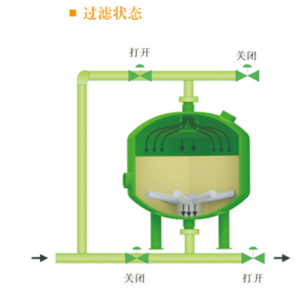 當(dāng)系統(tǒng)處于過濾狀態(tài)時,加壓水從濾罐進(jìn)口流入布水系統(tǒng),均勻的到達(dá)濾料層。當(dāng)水流過濾料層時,懸浮物被濾料截留。過濾器底部有帶縫隙的集水器,過濾后的干凈水被均勻收集,并流出過濾器。